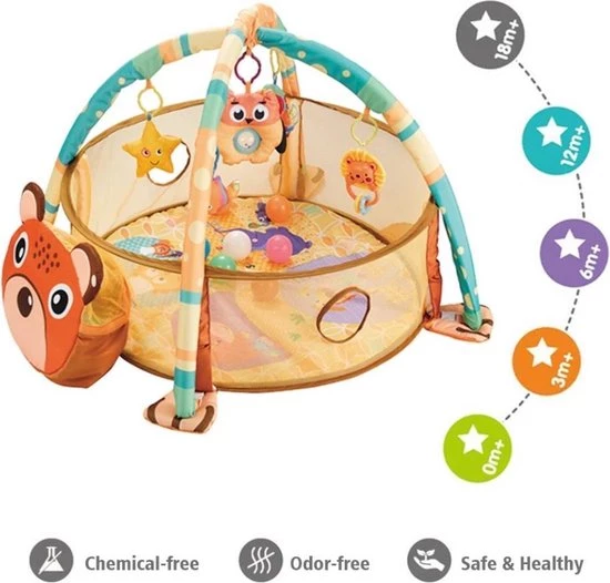 Ben jij op zoek naar een speelmat met boordevol speelplezier voor je kleintje? Dan is dit speelkleed ideaal voor jouw kind. Deze speelmat met 3 speelstanden is voorzien van leuke hangende diertjes, ballenbakballen en een leuk geanimeerde speelmat. Naast dat de speelmat erg speels is, stimuleert het ook nog eens de visuele en motorische ontwikkeling. Zo kan je baby zich met erg veel plezier ontwikkelen!
