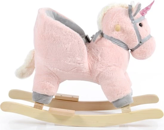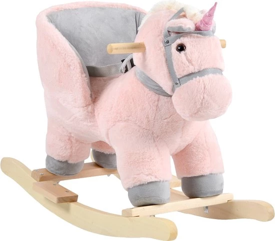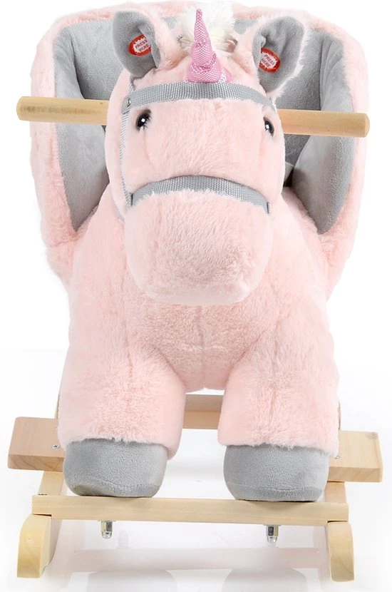 Het hobbeldier is een eenhoorn in het roze, als je kleine in de oren drukt zal de eenhoorn geluid maken. Je kindje kan zich vasthouden aan de houten handvatten en dankzij de voetensteunen kan je kleine zijn/haar voeten goed kwijt. Geschikt voor kindjes vanaf 12 maanden.