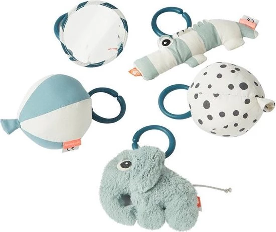 Het kleedje is superzacht en beschikt over gewatteerde punten. De bogen zijn met klittenband bevestigd aan het kleedje en kunnen gemakkelijk worden verwijderd, zodat je het kleedje ook los kunt gebruiken. De vijf speeltjes kunnen ook worden bevestigd aan een kinderwagen of buggy.