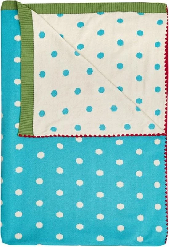 De Dushi yoga4kids deken is een 100 % katoenen deken speciaal voor Dushi yoga4kids ontwikkeld. De prachtige gebreide deken is turquoise met offwhite stippen aan de ene kant, en offwhite met turquoise stippen aan de andere kant. De superzachte deken is aan de 2 korte kanten afgewerkt met een groene ribbel steek en de 2 lange kanten met rode feston steek.