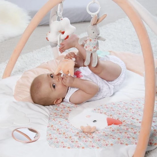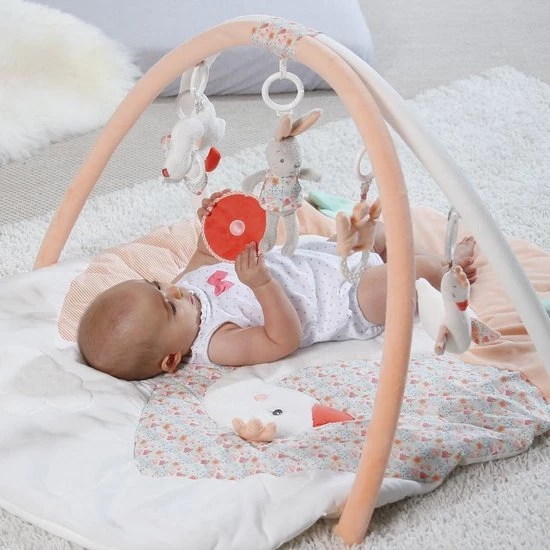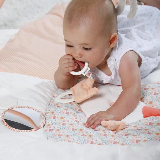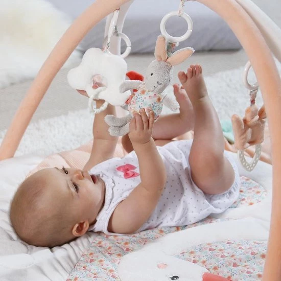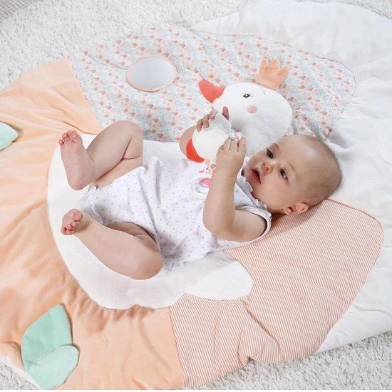 Dit leuke speelkleed Zwamenmeer van Fehn is 105 cm groot en is de perfecte speelplek voor je kleine wereldontdekker. Het liggedeelte is erg zacht en comfortabel. Verschillende materialen nodigen uit om te voelen, knuffelen en spelen. Het kleed heeft een afneembare spiegel en het speelgoed dat aan de bogen hangt is makkelijk te grijpen door kleine handjes. Dankzij praktische bevestigingsringen zijn de kleine speelknuffeltjes makkelijk afneembaar en zorgen ze voor plezier thuis en onderweg. Verder kunnen de kleurrijke bogen van elkaar geklikt worden.