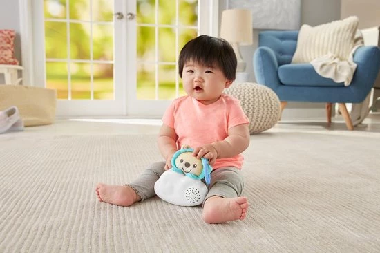 Grofmotorische vaardigheden: Baby’s kunnen liggend tegen de hangende speeltjes boven hun hoofd slaan. Als je baby op zijn of haar buik speelt, worden de hoofd-, nek- en schouderspieren getraind.