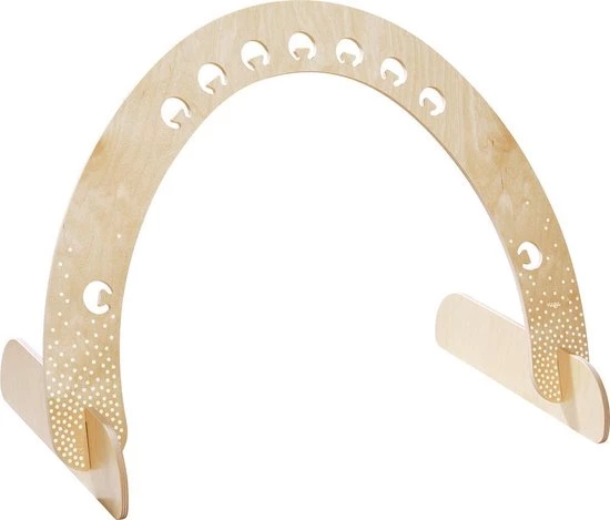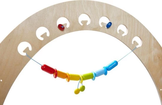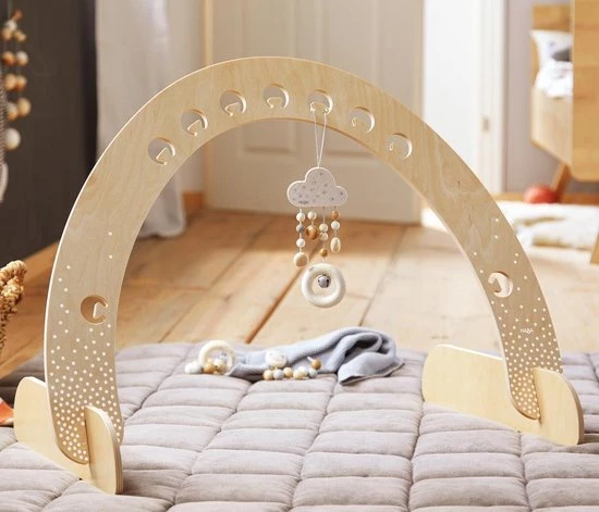 Hier liggen baby’s gegarandeerd niet zomaar wat voor zich uit te staren! De sober vormgegeven babygym van hoogwaardig berkenmultiplex past perfect in elk interieur en dus in elke woon- of kinderkamer. Hij biedt voldoende ruimte voor de eenvoudige bevestiging van allerlei speelgoed met een lus, klem, ring enz. De baby kan dan op de rug liggend naar de rammelaars of andere hangelementen grijpen.