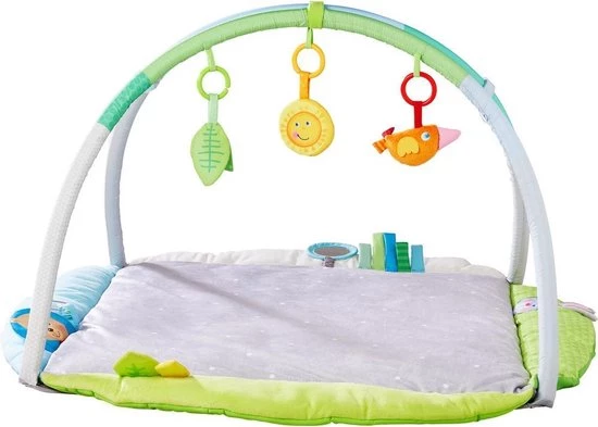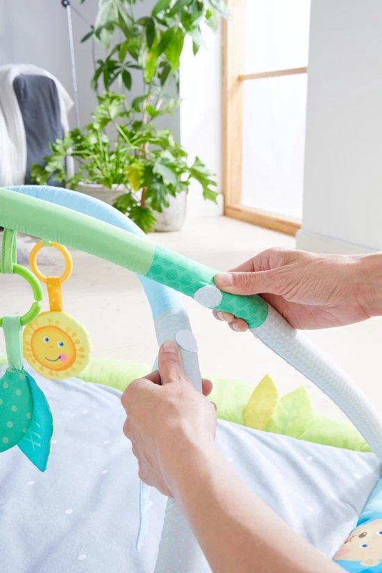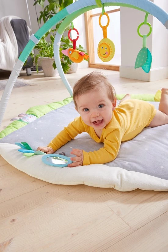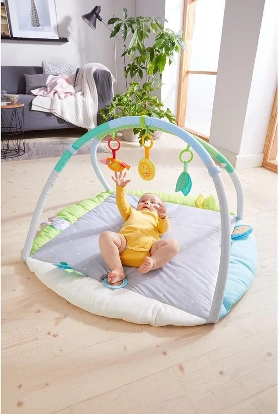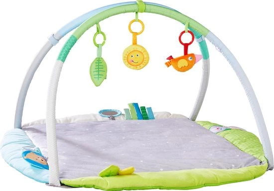 Met de speeltrainer is verveling gegarandeerd uitgesloten, want hij biedt baby’s talrijke interessante visuele en akoestische effecten om te ontdekken. Op het extra zachte dekentje liggen de kleinsten heerlijk comfortabel en kunnen ze, op hun rugje liggend, naar de rammelaars en andere hangelementen grijpen.