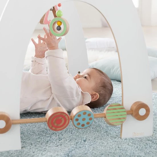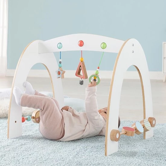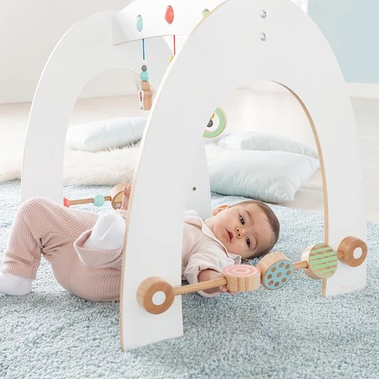 De baby gym “minimaster” maakt indruk met zijn mooie stabiele vorm en het aangename moderne kleurenschema. Natuurlijk bevat de spelboog veel details voor de kleintjes. De liefdevol ontworpen baby gym laat de kleintjes de diverse hangende houten elementen ontdekken en grijpen met ballen en bellen. Ook bijzonder zijn de mooie draaielementen aan de zijkanten van de spelboog. De kleuren zijn harmonieus afgestemd op het hoogwaardige hout. De activity gym motiveert de kleintjes om aan te raken, te grijpen en te ontdekken. Door het volgen van de bungelende details van het hout met hun ogen, oefenen baby’s bovendien hun visuele ontwikkeling en kleurenvisie op.
