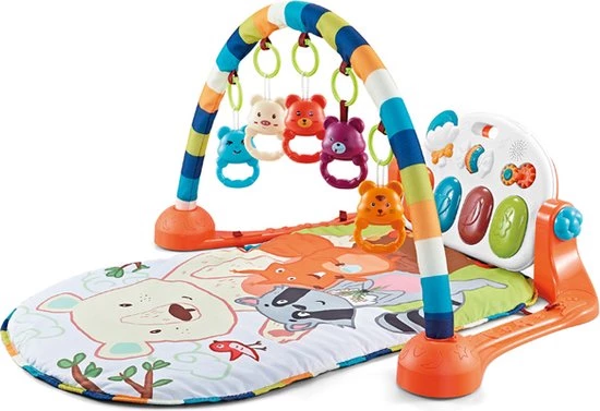 Deze Luxe babygym bevat urenlang speelplezier voor je baby, thuis én onderweg! De draagbare, gewatteerde speelmat is een heerlijke plek om te liggen en te spelen, op de buik te draaien, of zittend te spelen. Om je kleintje bezig te houden bevat het speelkleed een stevige boog met 5 verplaatsbare speeltjes. Daarnaast bevat de babygym ook nog een multifunctionele piano voor extra speelplezier. De piano is op verschillende manieren te gebruik. Door de speciale voetenfunctie kan je baby al liggend de piano bedienen en muziek maken. Zodra je baby een zittend houden kan hebben, is het ook mogelijk om de piano met de hand te bedienen. Verder kan de piano verschillende geluidjes maken en muziekjes spelen met een tijdsduur van maximaal 10 minuten. De babygym is het speelgoed waar spelplezier en ontwikkeling samen komen. Zo leveren de diverse kleurrijke activiteiten, muziek, geluidjes en grappige structuren een bijdrage aan het ontwikkelen van de visuele en auditieve tastzintuigen van je baby. De speelmat is erg comfortabel en veilig ingesteld. Ook is het speelkleed makkelijk te verschonen en kan zonder enige problemen de wasmachine in.