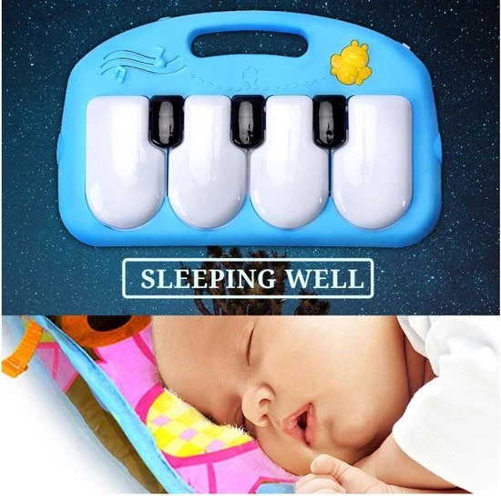 Met deze vrolijke, interactieve baby gym met piano zal jouw kleine zich uren vermaken. Doordat het speelkleed heerlijk zacht is ligt je kleine comfortabel. De hangertjes en speeltjes van de baby gym zorgt ervoor dat de zintuigen en motoriek van jouw kleine wordt gestimuleerd en ontwikkeld. Al liggend op de rug, kan je kleine heerlijk tegen de pianotoetsen aan trappen om muziek te maken onder begeleiding van vrolijke lichteffecten. De hangers en piano zijn afneembaar en hierdoor eventueel mee te nemen voor onderweg of naar bed!