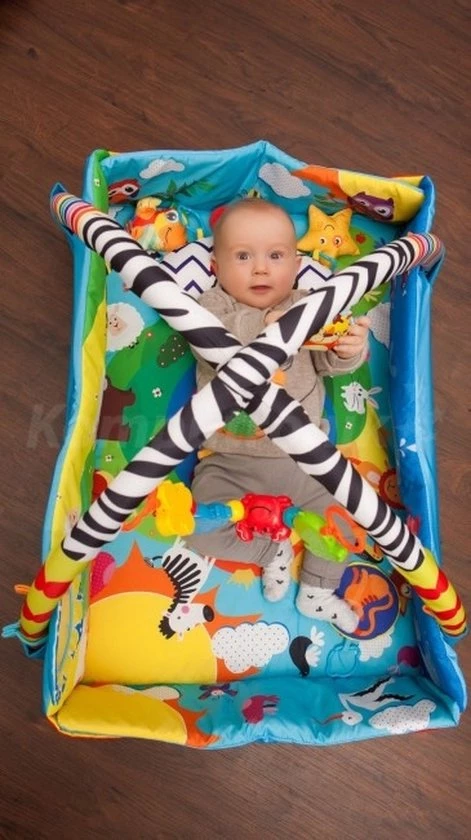 Dankzij de verhoogde zijkanten en klittenbandsluitingen op de hoeken, kan de mat in een paar seconden worden veranderd in een comfortabele box, die overdag als babyspeelcentrum zal dienen.
