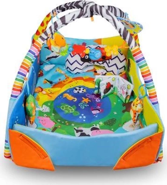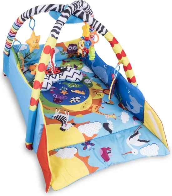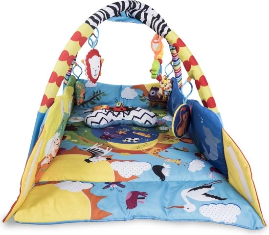 Zintuiglijke stimulatie. Kinderen in de eerste levensmaanden ontdekken de wereld vooral door te zien en te voelen. Deze Anika speelkleed zal de baby vertrouwd maken met vormen en kleuren, wat zorgt voor de ontwikkeling van zijn motorische en visuele coördinatie en ruimtelijke vaardigheden. Unieke afdruk. Anika is gebaseerd op levendige en kindvriendelijke kleuren die de aandacht trekken van een kleine ontdekker, terwijl hij zijn verbeeldingskracht en concentratievermogen ontwikkelt. Het patroon is zo ontworpen dat het kind al spelend dieren leert herkennen. Met behulp van de mat kan je kleintje leren over het prachtige verhaal dat op het patroon wordt gepresenteerd. Deze speelkleed heeft dubbelzijdig speelgoed met geluid. Wanneer dat op de handvat van het speelgeod wordt gedruks komen er verschillende geluiden uit, wat de baby aanmoedigt om ernaar te reiken en tegelijkertijd de spieren van de handen te oefenen. De bedrukking aan de ene kant van het speelgoed is van een andere kleur dan aan de andere kant. Tijd om je baby op de buik te leggen. Naast het speelgoed bevat de set ook een speciaal kussen om op de buik te liggen. Dankzij dit kan de baby tijdens het spelen de spieren van de armen en rug versterken, wat hem voorbereidt op het zelfstandig zitten. Een comfortabele ondergrond. Zachte en dikke vulling zorgt voor voldoende isolatie van de vloer. Dankzij deze zal de baby altijd warm hebben. In de lente- en zomerperiode kan de mat ook buiten gebruikt worden. Anika heeft een meerdere verificaties ondergaan in het onafhankelijke Intertek-certificering laboratirum. Het product voldoet aan de Europese veiligheidsnorm EN 71. Anika kan gebruikt worden als educatieve mat met bogen of als box met verhoogde zijkanten van de mat. Daarnaast kan de baby dankzij het kussen ook op zijn buik liggen, naast de standaard houding op de rug. Makkelijk schoon te maken. Het materiaal van de mat is niet alleen aangenaam om aan te raken, maar ook slijtvast en uiterst gemakkelijk schoon te maken. Handwasbaar tot 30 graden.