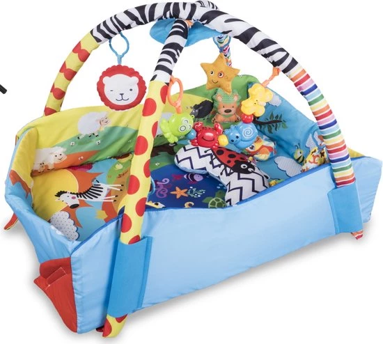 Een rijke set speelgoed ontwikkelt motorische en handmatige vaardigheden. Speelgoed in verschillende vormen en kleuren heeft extra functies – individuele elementen ritselen bij aanraking, piepen en rammelen, wat de aandacht van de baby trekt. De set bevat ook een veilige bijtring en een flexibele spiegel.
