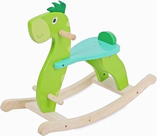 Een vrolijke houten hobbel draak met veilg rekje en voet steun voor peuters. Het zitje is afneembaar, zie foto’s. Het hobbelpaard is van gekleurd gelakt hout.