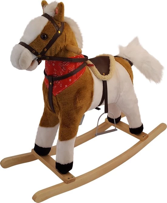 Pluche bont hobbel paard met zadel van het merk Playwood.