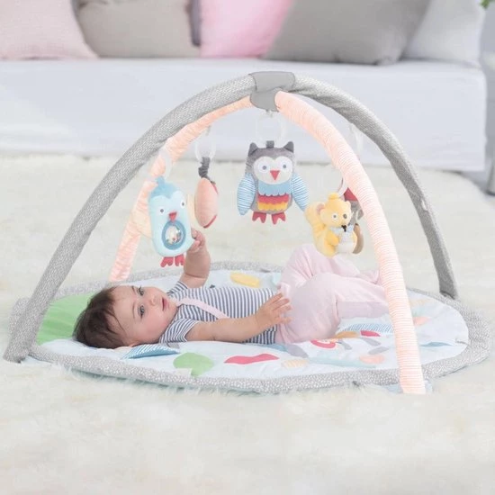 Deze geweldige Activity Gym van Skip Hop laat je spelen met al je vriendjes uit het bos. De uil, eekhoorn, de vogeltjes en de appel zullen je baby urenlang bezighouden. De een is een rammelaar, de ander piept en knispert… In totaal bevat dit speelkleed 17 activiteiten, inclusief de mat. Je kunt de speeltjes zo hoog of laag hangen als je zelf wilt. Het tummy-time kussen is ondersteunend zodat je kindje lekker op zijn of haar buikje kan spelen.