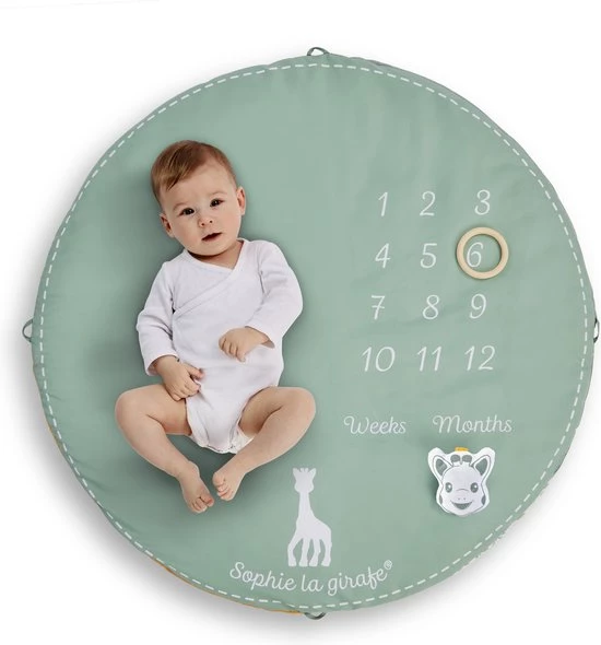 Verwijder de bogen, draai de mat om en ontdek een mooi fotokleed! Leg de baby op de mat, omcirkel zijn leeftijd met de houten ring en plaats het hoofdje van Sophie de giraf onder ‘week’ of ‘maand’! Fotografeer de baby en leg zijn ontwikkeling week na week en maand na maand vast als mooie herinneringen van elk moment te hebben!