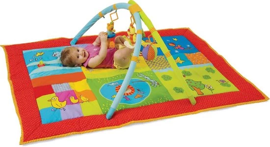 Deze extra grote 2-in-1 speelmat/gym van Taf Toys is gemaakt in vrolijke kleuren en biedt verschillende activiteiten voor extra veel speelplezier: afneembare bogen met afneembare speeltjes: muzikale vogel, een trekpoppetje en een muziekbal. Op de mat vind je verder nog een babyspiegel, plastic ringen, knisperende golven, springende vis en piepgeluidjes,. Deze vrolijke gym stimuleert, naast de zintuigen van je baby, ook de fijne én de grove motoriek. Met deze grote speelmat heb je gegarandeerd speelplezier, hij is extra groot en zacht waardoor je er lekker zelf bij kunt gaan liggen. Ook is deze speelmat makkelijk mee te nemen.