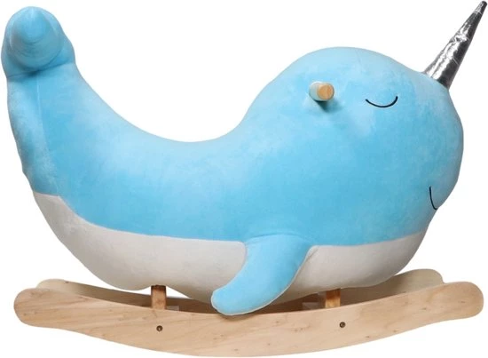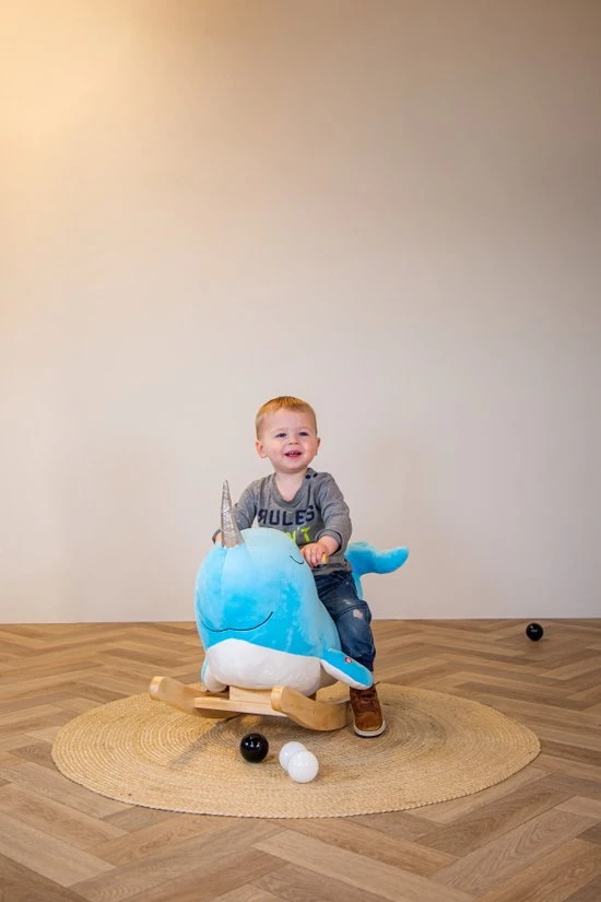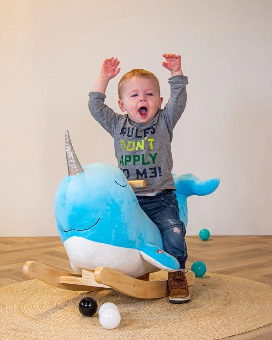 Je kindje hobbelt een eind weg op de rug van Nino de Narwhal van Tryco. Het hobbeldier is gemaakt van stevig hout en heeft handvatten waar je kindje zich aan vast kan houden.